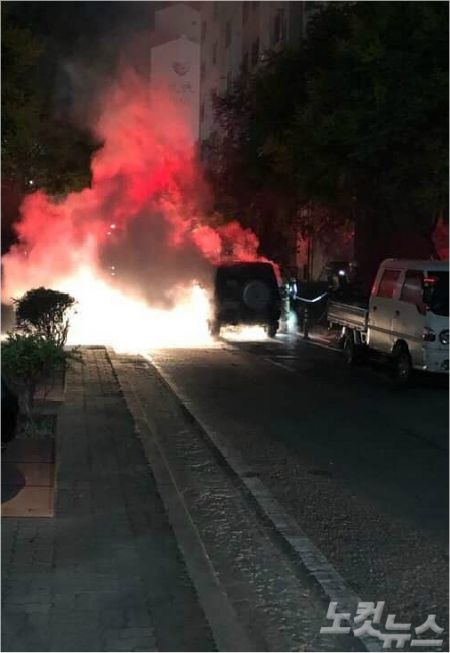 지난 17일 오후 10시 19분쯤 전북 전주시 송천동 한 아파트 단지 내 지상 주차장에 있던 갤로퍼 차량에서 불이 났다. (사진=독자제공)